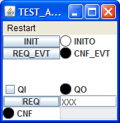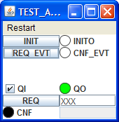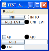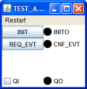 | 1. The initial situation. | 2. The INIT event creates the GUI elements. | 3. Entering data and clicking REQ has no effect, since there is no socket to receive this event and data. | 4. Changing the state of QI and clicking REQ_EVT passes the value through to QO, independent of the plug interface. |